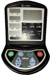 Program control board from the console assembly of the Keys Fitness Alliance A7e Elliptical. The console part number is 307-00062. This control board processes user inputs from console buttons, displays workout data (time, speed, distance, calories, pulse, level, watts, strides), controls magnetic resistance (16 levels), manages preset programs, quick start, and heart rate monitoring via hand pulse sensors. | |||